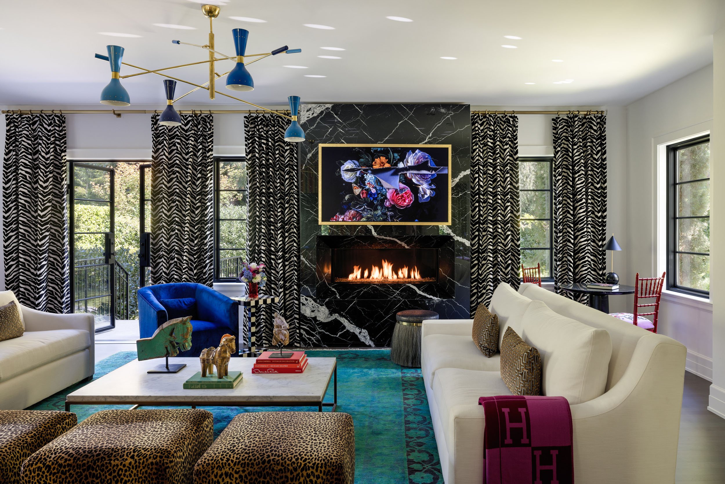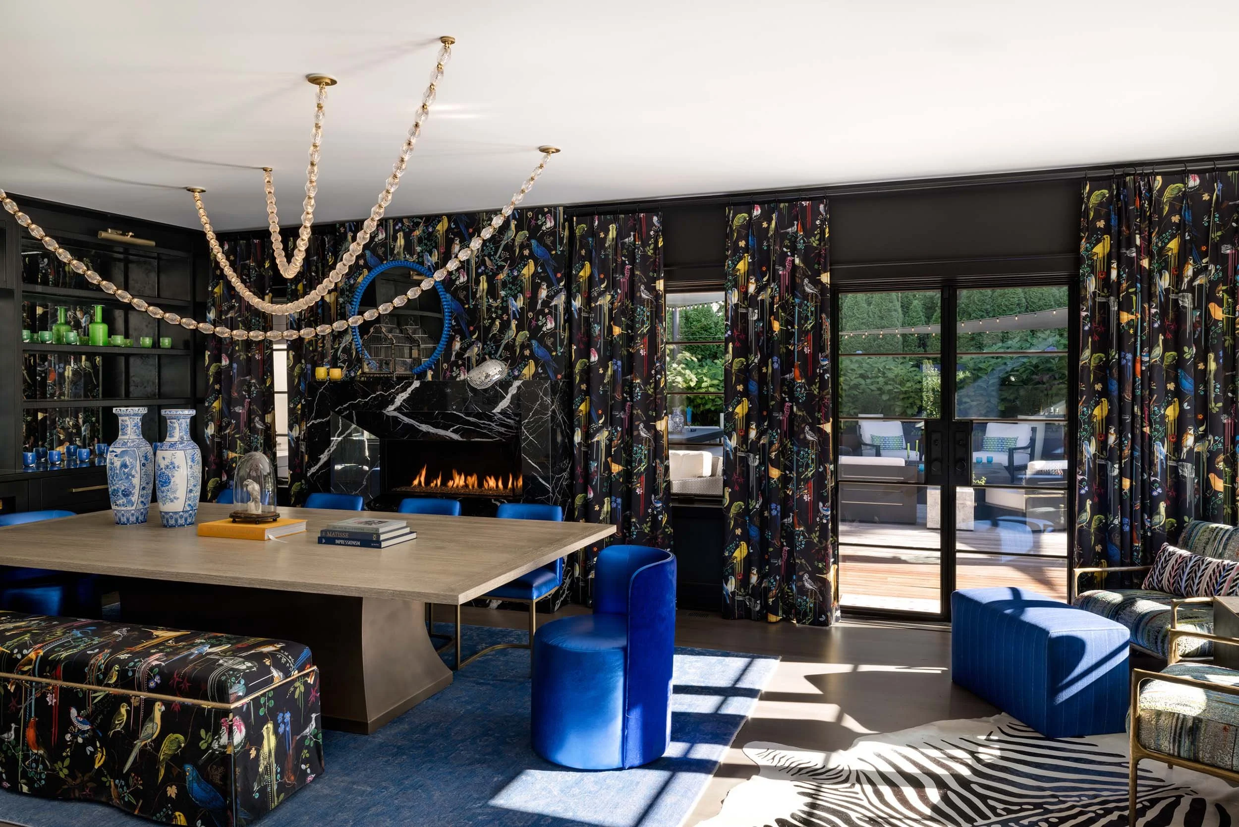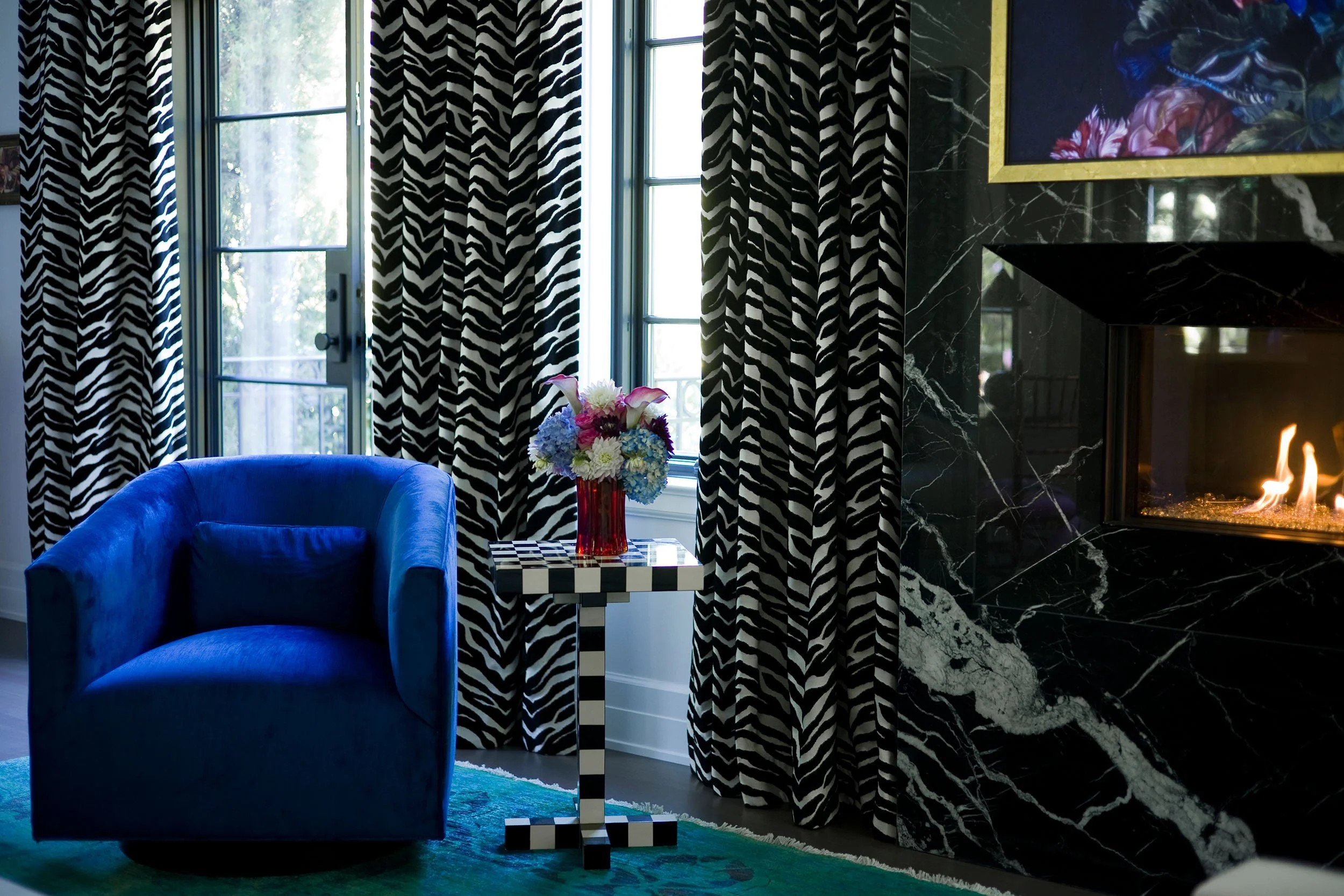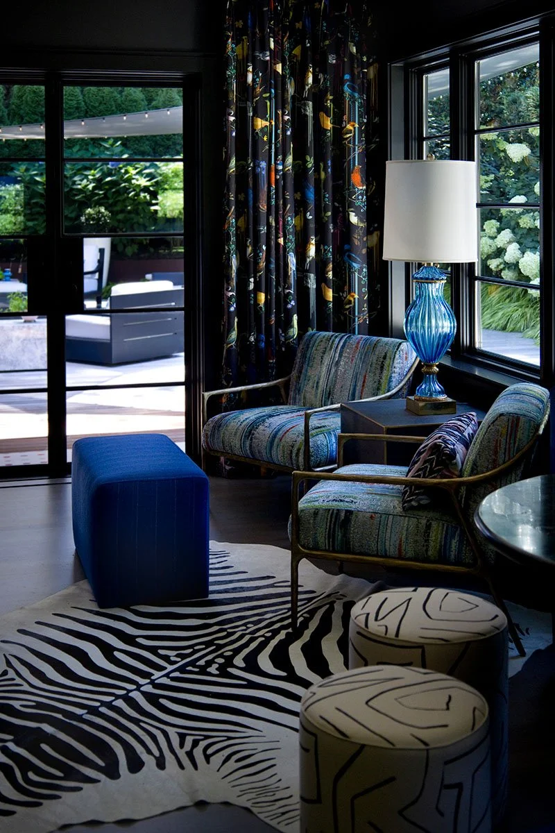 This project brings together bold design and a strong sense of personality through close collaboration between Studio TF and the homeowner, who led the interior design vision. Studio TF partnered with the homeowner to create a clear architectural framework that supports and enhances the layered interiors. Graphic drapery, patterned carpet, sculptural lighting, and saturated color add energy and contrast throughout the spaces. Thoughtful detailing and well-proportioned rooms allow art, furnishings, and personal collections to stand out, resulting in a home that feels expressive, balanced, and distinctly personal.